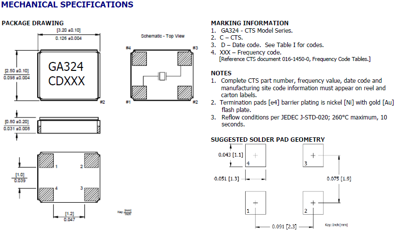 CTS晶振,貼片晶振,GA324晶振.3225mm體積貼片晶振適用于汽車電子領(lǐng)域的表面貼片型石英晶振,本產(chǎn)品已被確定的高信賴性最適合用于汽車電子部件,晶體在極端嚴(yán)酷的環(huán)境條件下也能發(fā)揮穩(wěn)定的起振特性,晶振本身具有耐熱,耐振,耐沖擊等優(yōu)良的耐環(huán)境特性,滿足無(wú)鉛焊接的高溫回流溫度曲線要求,符合AEC-Q200標(biāo)準(zhǔn).